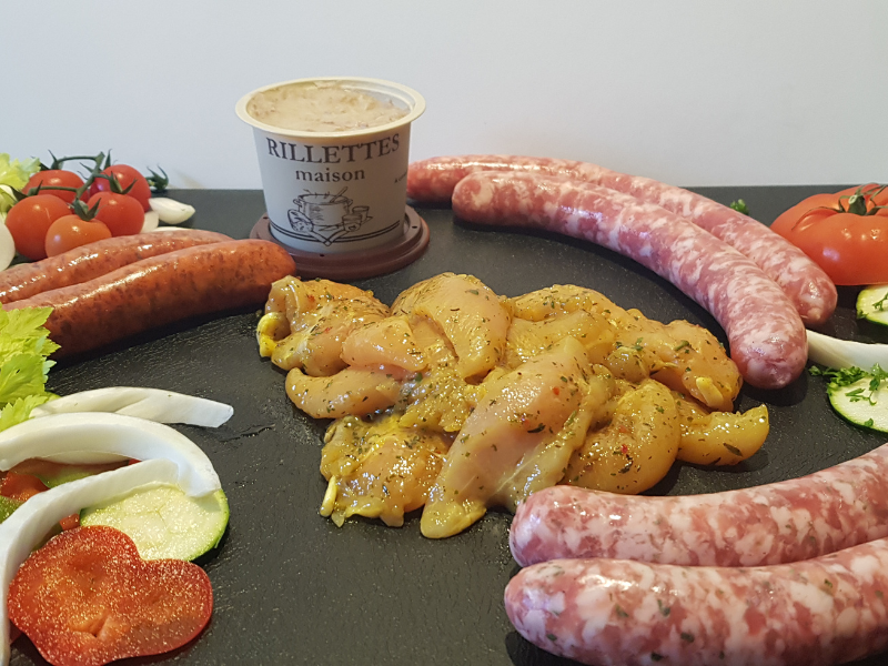 Pour les grillades : saucisses et chipolatas natures, saucisses et chipolatas aux herbes, saucisses et chipolatas au Muscadet, chipolatas Piment d’Espelette, roulades de porc au paprika, brochettes de dindonneau marinade mexicaine, brochettes de boeuf marinade échalotes, travers de porc marinade barbecue, poitrine de porc marinée aux herbes…